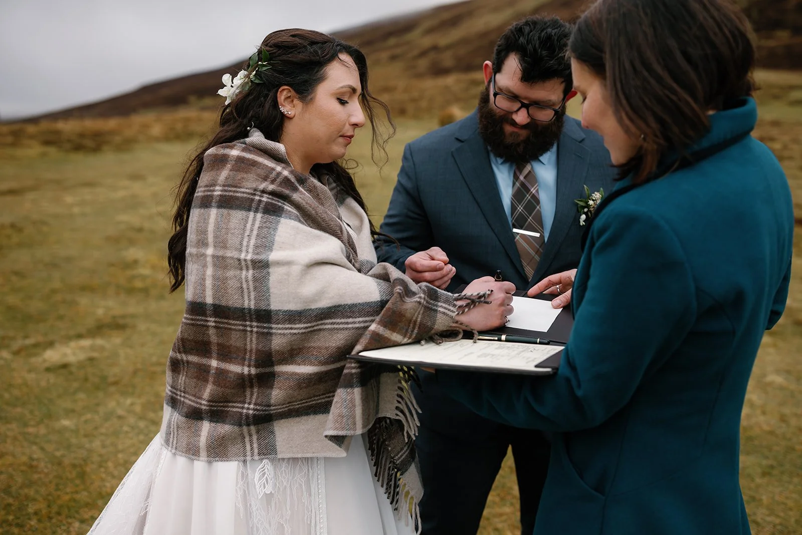 An officiant performs the legal marriage and ensures statutory wording and documentation are completed.